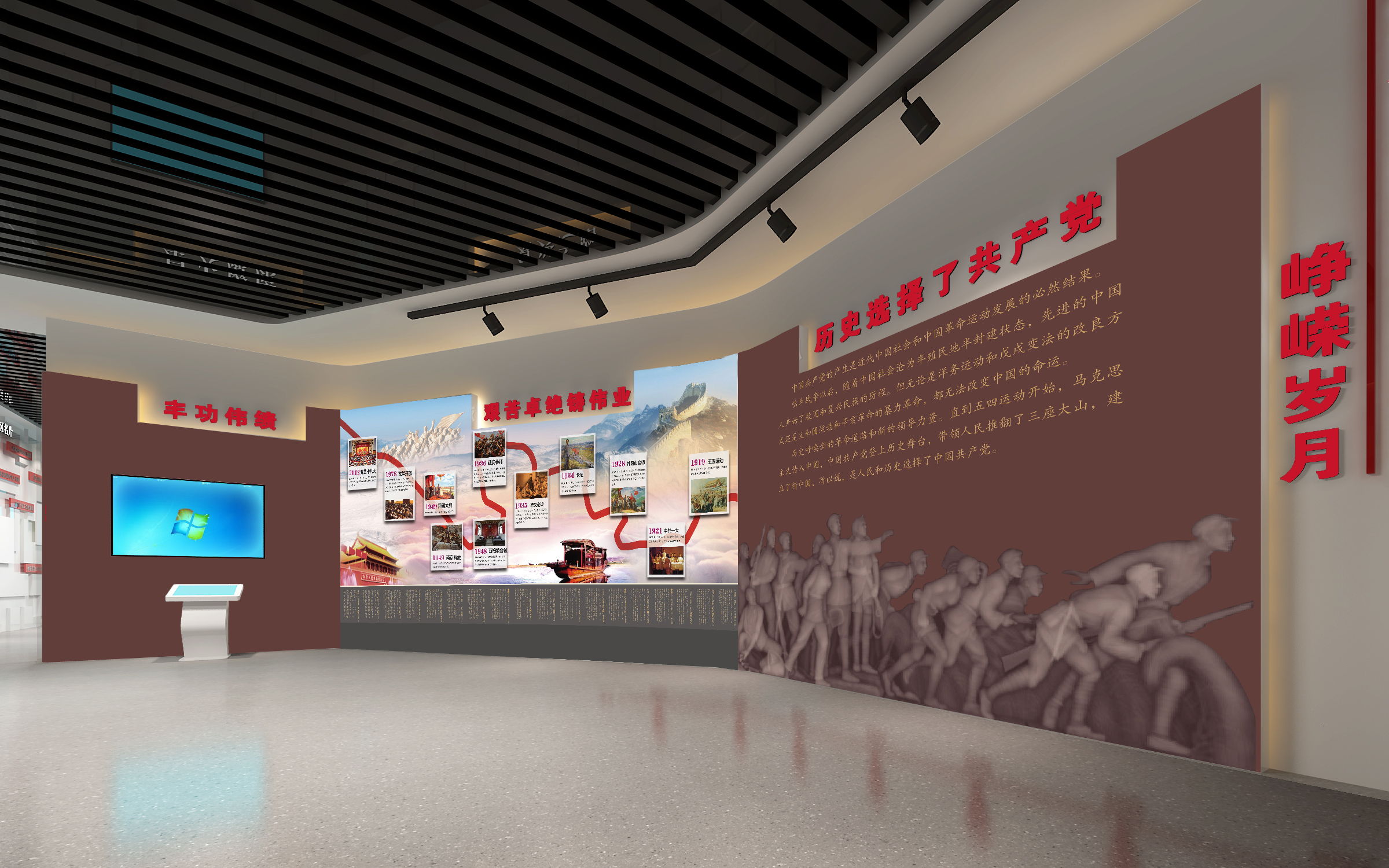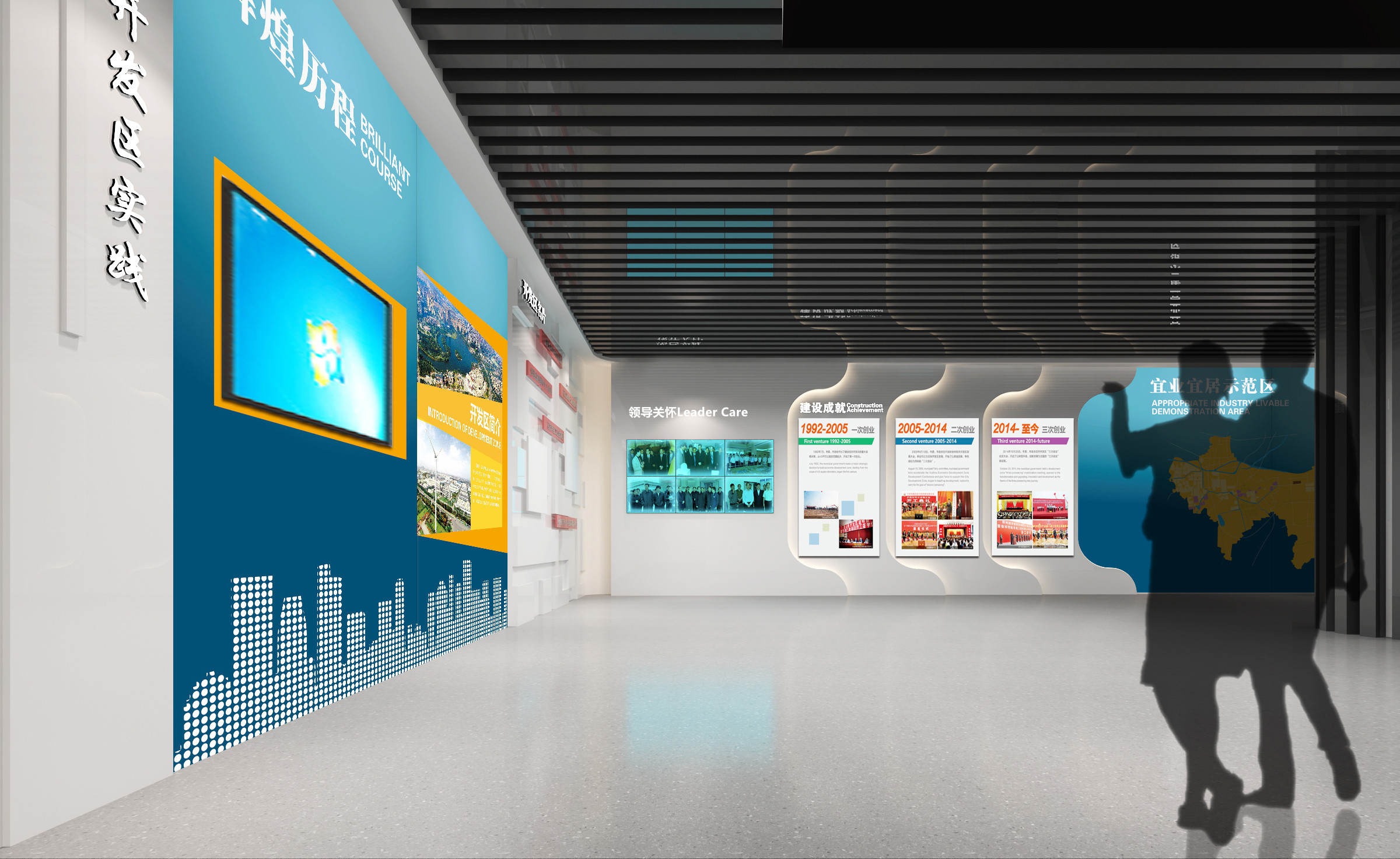 其中布展建筑面積約880平方米,共分為序廳、薪火相傳、開發區實踐、黨的建設、黨群建設等五部分,用流暢緊湊的參觀流線,系統展示徐州經濟開發區全面貫徹黨的精神,緊緊圍繞“三次創業”的發展戰略,努力建設“經濟強、百姓富、環境美、社會文明程度高”的升級版的國家級開發區的輝煌前景。另外配套設置了主題展廳、圖書閱覽室、黨員“創客”夢吧、群團活動中心、心靈驛站、黨員教育室、遠程教育室、接待室、咖啡吧、便民超市、辦公室、檔案室、流動黨員活動站、多功能廳等空間。