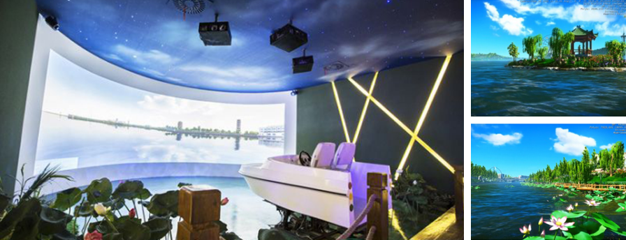 虛擬游船漫游系統又叫仿真船駕駛---真實模擬船在水中行進的動感效果,同時讓參觀者欣賞海洋上的的風景。為參觀者提供一個逼真的水面的環境,從視覺上、聽覺上、感覺上和觸覺上模擬船從啟動、行駛、顛簸等過程,并能感受到不同的時間、不同的氣候、不同的景點的景觀,小船行駛的過程中,動力設備可以模仿船舶真是行駛時的搖曳和擺動,同時特效設備可配合場景制造淋雨、飄雪、閃電、刮風等天氣變幻的效果。給體驗者一個完美的享受。