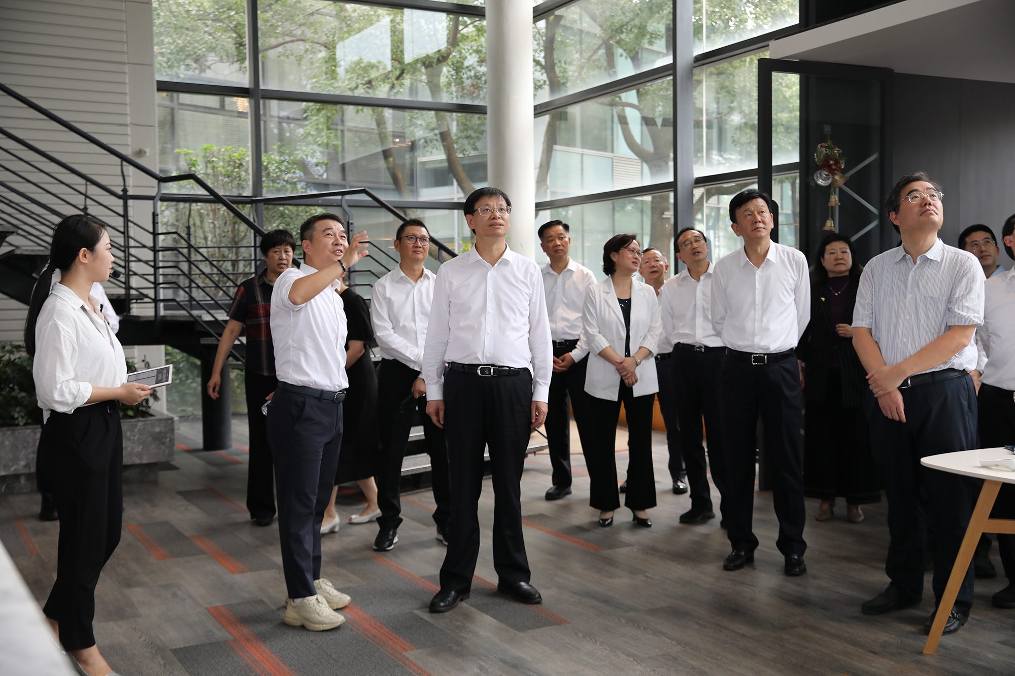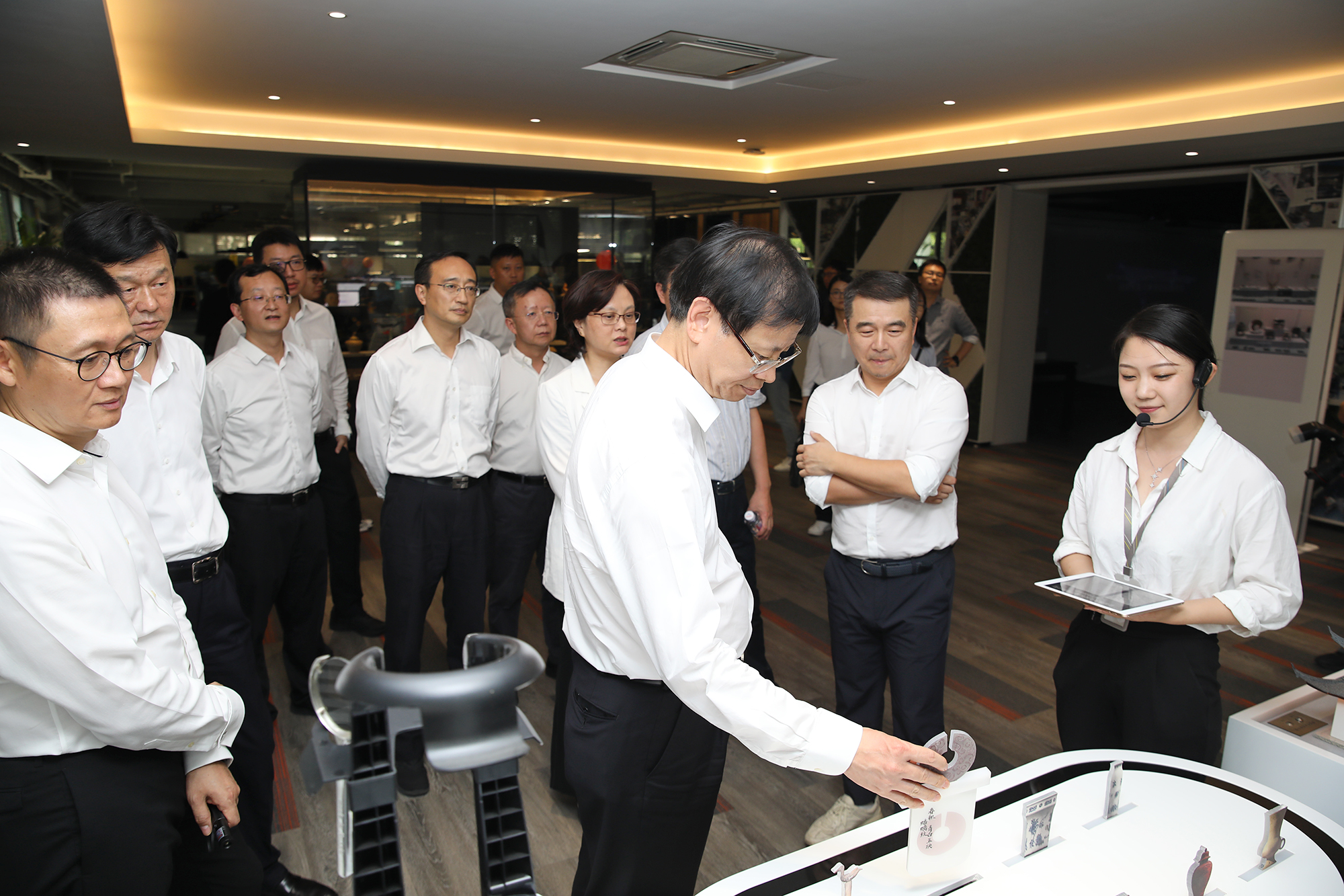 許書記詳細聽取金螳螂文化公司相關業務介紹,實地體驗科技產品應用情況,勉勵企業繼續加大科技研發投入,豐富展陳設計,借助金螳螂文化總部大樓建設的契機,打造文化創意的新高地。