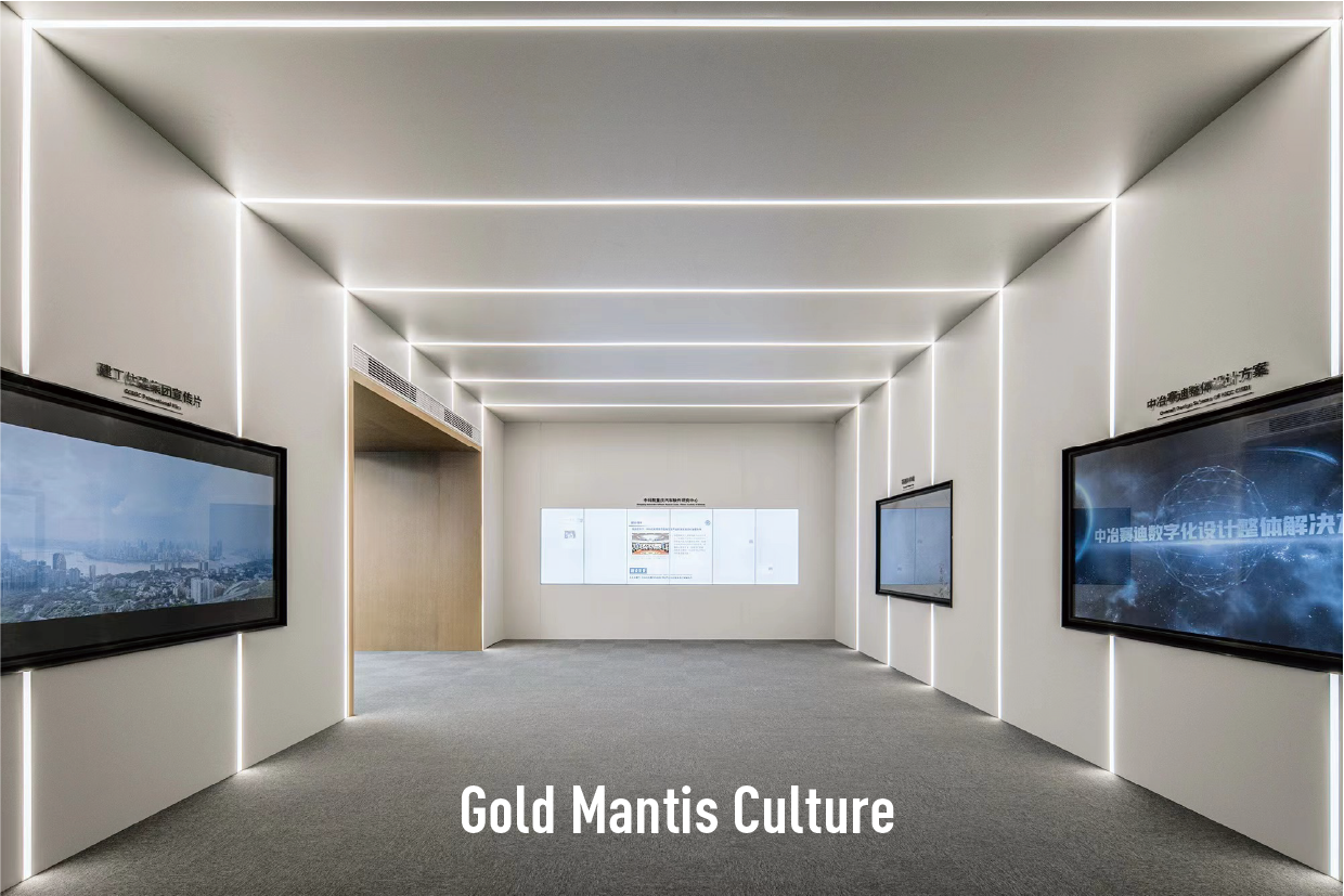 項目建設過程中,為了更好地展示項目應用的智慧工地、綠色施工、前沿技術等創新亮點,金螳螂文化項目團隊從空間布局、項目展示、交互體驗等方面著手,結合建設單位中冶賽迪智慧建造、綠色低碳等前沿創新技術,打造項目必備的靈魂展示窗口。