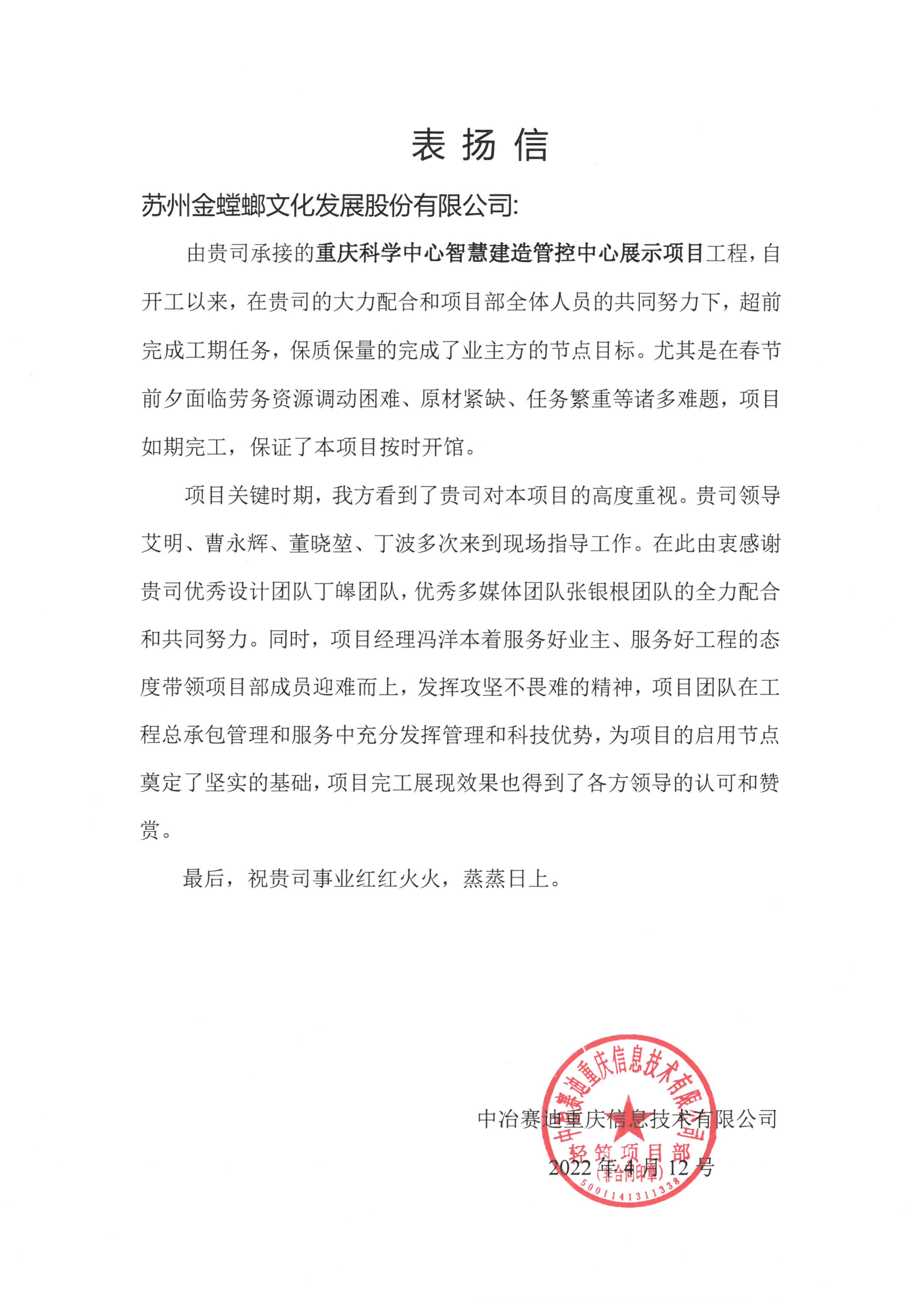 業主單位中冶賽迪向金螳螂文化發來表揚信