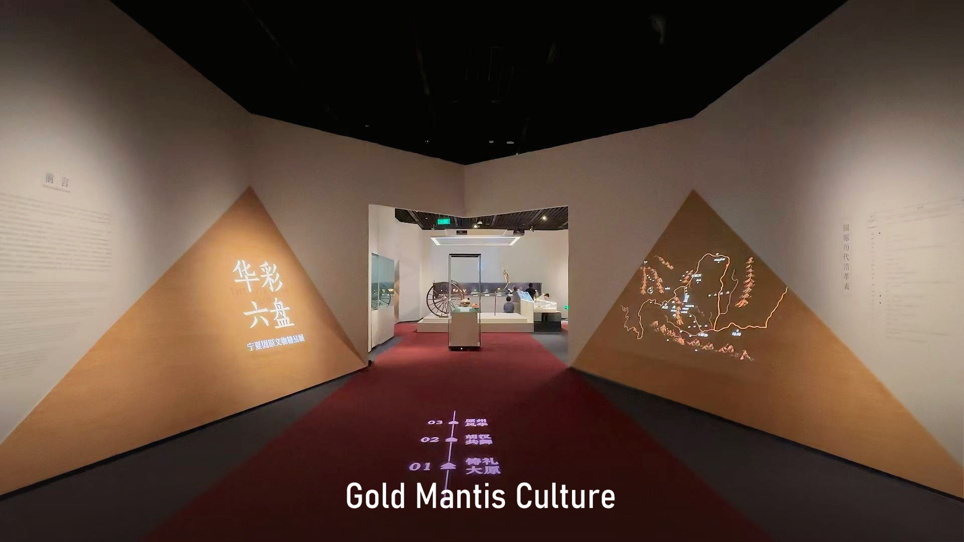 展廳以“三角形”作為核心視覺符號,通過二維與三維的表現手法,使其貫穿始終,隱喻固原在地理、歷史、軍事、貿易、文化交流等諸多方面的重要地位。